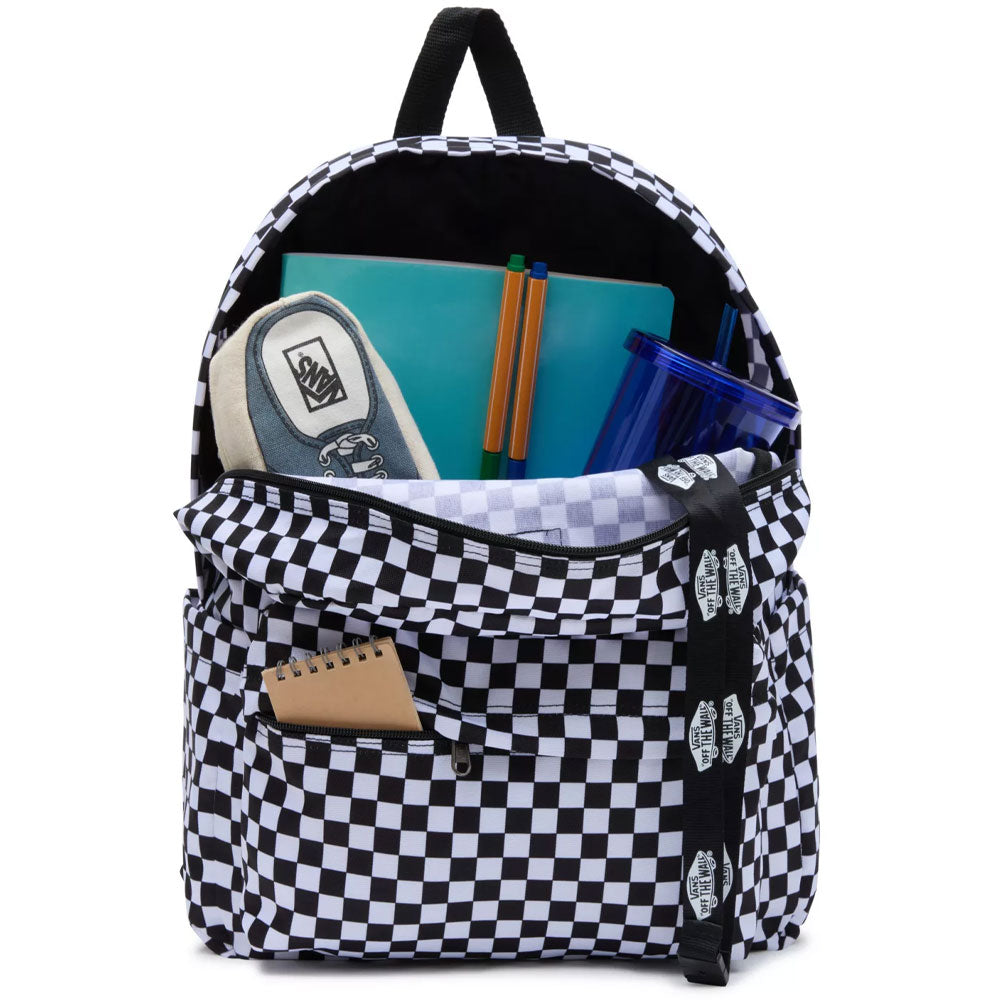 The Vans Old Skool Check Backpack features one large main compartment, a front zip pocket with an organiser for easy access and a water bottle pocket. Straight-cut padded shoulder straps give this bag extra comfort.