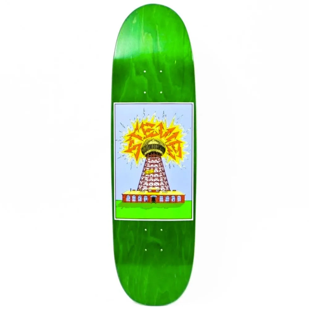 Stevies guest pro board features the Wardenclyffe Tower, ones of Nikola Tesla's most exciting creations and never finished. Stick it in ya search engine! Hand screened on an 8.75 football shape.