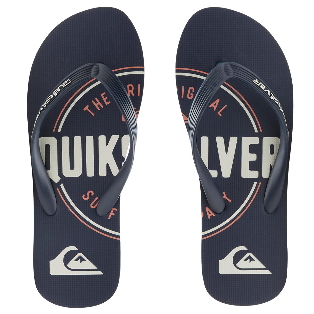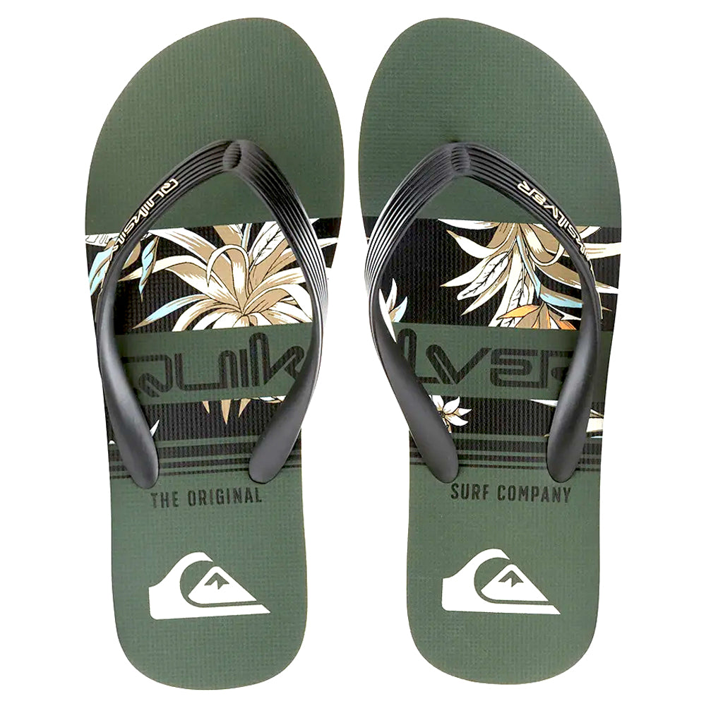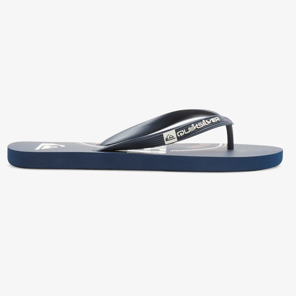 Flexible 3 point synthetic rubber flip flops from Quiksilver wordmark featuring the Mountain Wave logo.