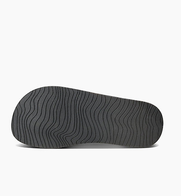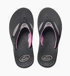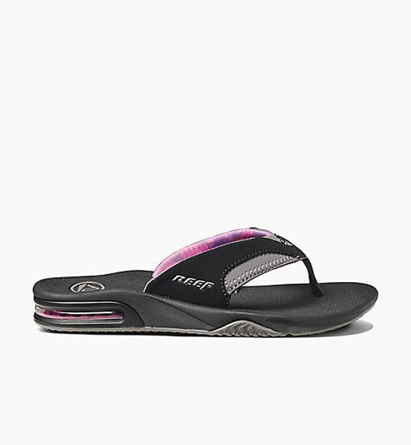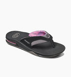 Reef Fanning Flip Flops - Black/Grey - Designed specifically for a woman's active lifestyle, the women's Fanning sandal is the ultimate athletic sandal. Contoured injection molded EVA footbed with anatomical arch support and full 360-degree heel airbag enclosed in soft poly, comfortable water-friendly synthetic nubuck upper, and Reef Icon Herringbone rubber outsole. And in the fun department, these bottle opener sandals feature a church key built into the footbed to open your soda after a surf or hanging at the pool.