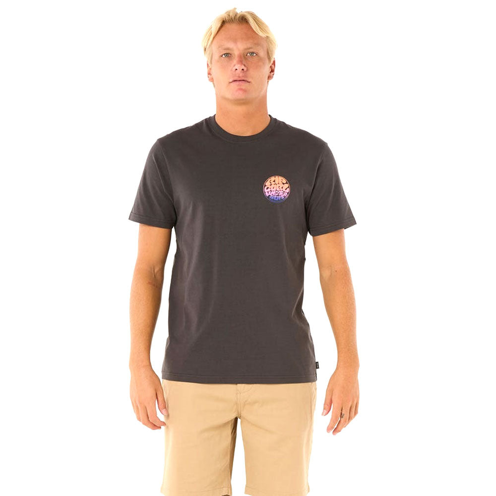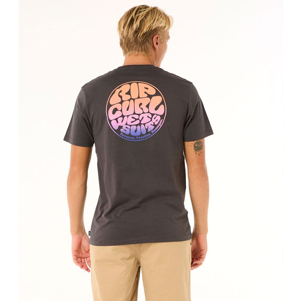 The Rip Curl Wettie Passage Icon T-Shirt features distinctive Rip Curl branding with prints on both the front and back, complemented by a woven flag label.