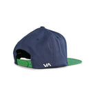 The RVCA Twill Snapback cap is a classic snapback with embroidered branding on the front-facing panels and smaller detailing at the rear. Features a navy crown structure, green visor and snap with white details.